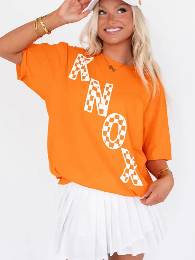 This vibrant orange unisex tee features a bold checkered "Knox" print across the front, adding a fun and energetic touch to your casual wardrobe. Made for comfort and style, it’s perfect for standing out while keeping things playful and relaxed.