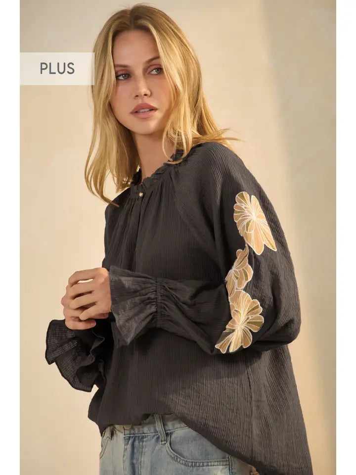 Crinkled peasant blouse with floral embroidery at sleeves and ruffled cuffs.