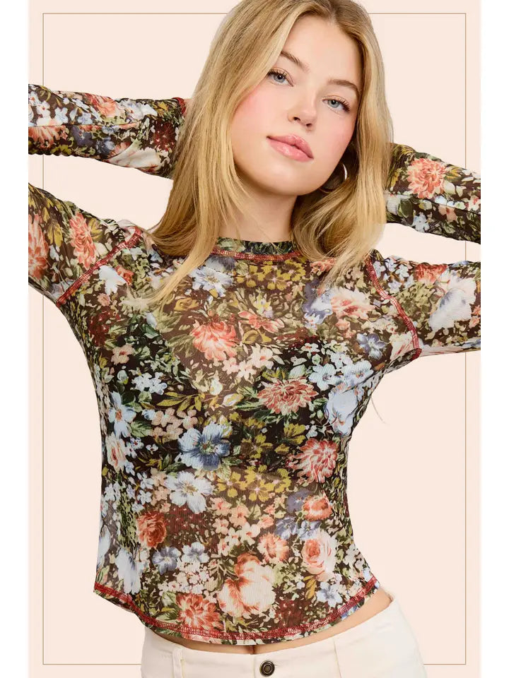 Perfect for layering, this mesh top is featured in a semi sheer design with floral pattern, fitted long sleeves, crew neckline and stretchy fabrication with exposed stitching. This simple top is the perfect lightweight layer throughout all season. Layer up or style solo for a variety look.